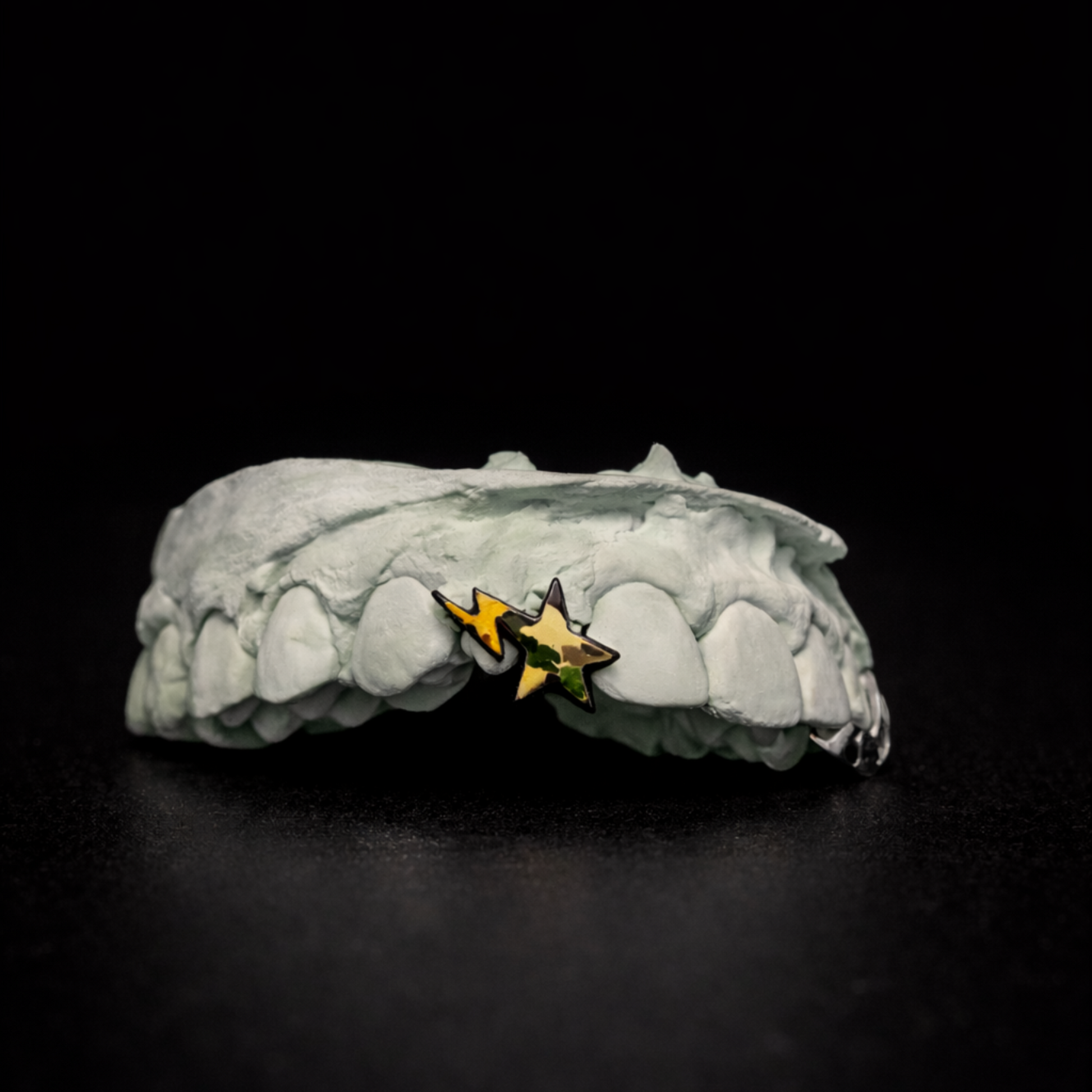 The Camo Bapesta Grill blends iconic streetwear inspiration with fine jewelry craftsmanship. Featuring custom enamel Bapesta star details, this grill is designed to stand out while maintaining a clean, polished look.
