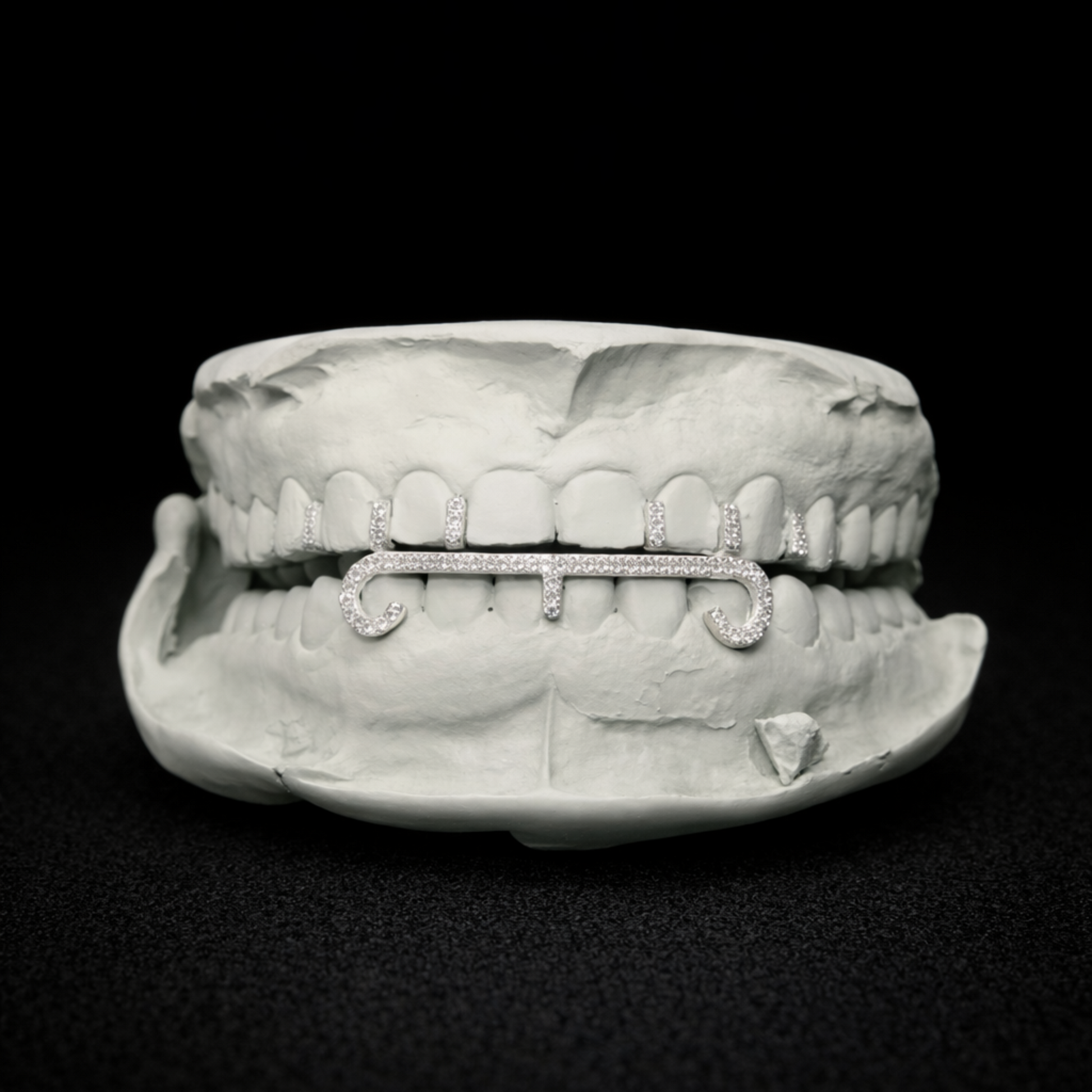 The Diamond Gap Filler w/ Bar blends refined jewelry craftsmanship with bold signature styling. Featuring a diamond-set bar centerpiece with curved ends and iced accent caps, this grill delivers a clean yet standout look designed to elevate your smile.