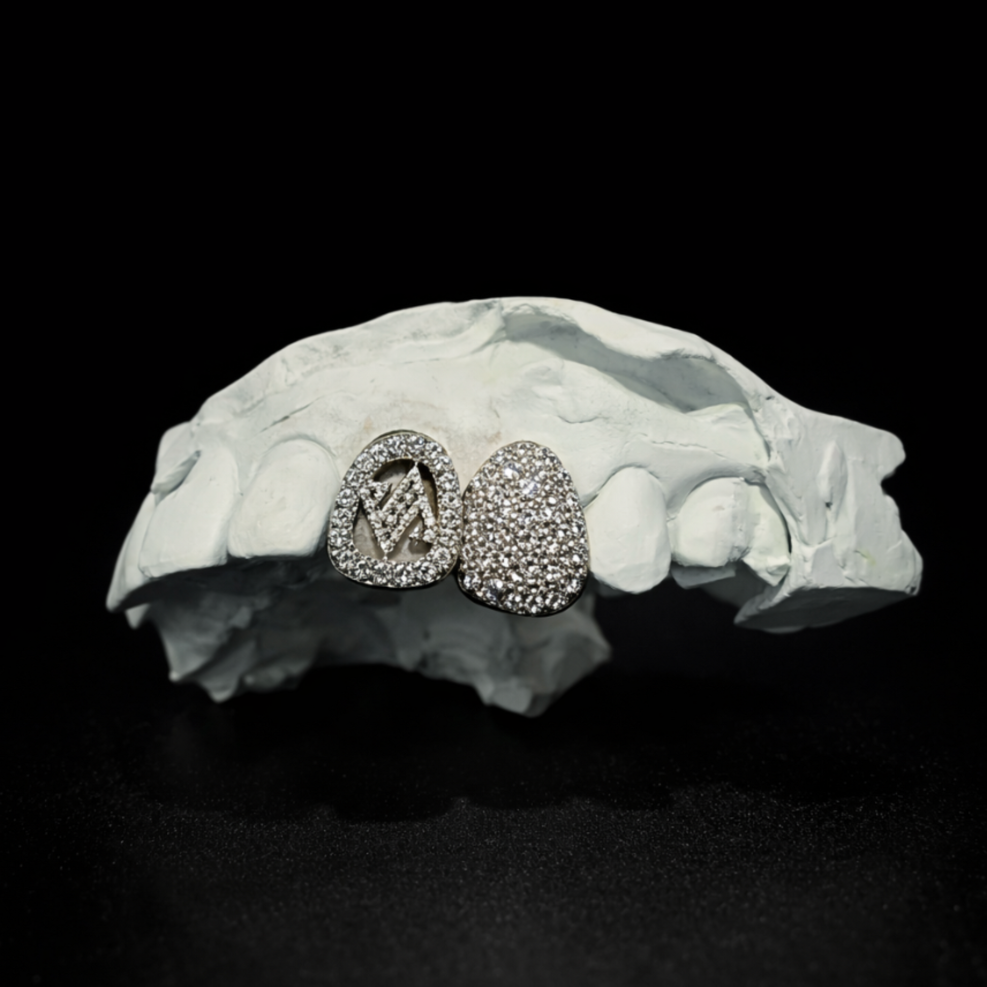 The 2 Teeth Custom Bussdown Grill is a bold two-cap design created for those who want their jewelry to speak for them. Featuring a combination of a fully iced cap, mosaic setting and a custom logo or letter cap, this piece blends individuality with luxury craftsmanship.